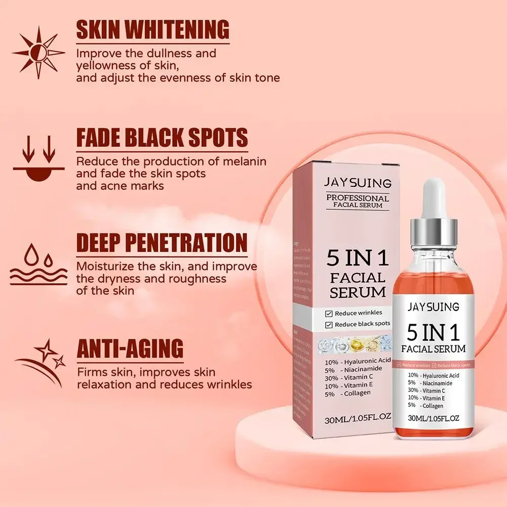 .This 5-in-1 facial serum delivers complete skin care in one formula. It deeply moisturizes the skin with hyaluronic acid. Vitamin C helps brighten the complexion and improve skin tone. The serum supports reduction of fine lines and wrinkles. It helps minimize the appearance of pores for smoother skin. Lightweight and fast-absorbing, it feels comfortable on the face. Regular use improves skin elasticity and softness. The formula is suitable for daily skincare routines. It works well for most skin types. This serum helps achieve hydrated, radiant, and youthful-looking skin.